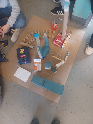 Verwendet haben wir überwiegend Recyclingmaterialien: Kartons, Joghurtbecher, Papierrollen, Strohhalme, Pfeifenreiniger, Pappe und Naturmaterialien wie Steine und Moos. Aus Milchtüten wurden Hochhäuser, aus Schwämmen grüne Parks, und aus Eisstielen wurden Bahnschienen. Und natürlich durften unsere Zukunftsvisionen nicht fehlen: von fliegenden Autos bis zu solarbetriebenen Seilbahnen war alles dabei.
