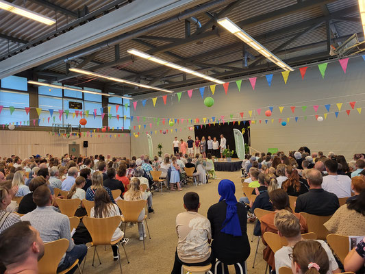 Eltern, Familie, Lehrkräfte und ältere Schüler*innen versammelten sich für diese feierliche Einschulung in der Sporthalle der Alfred-Nobel-Schule - bunt geschmückt und bereit erkundet zu werden. Beim Eintreten erhielt jedes Kind eine Holzmünze in einer von vier Farben. Was die wohl zu bedeuten hat?