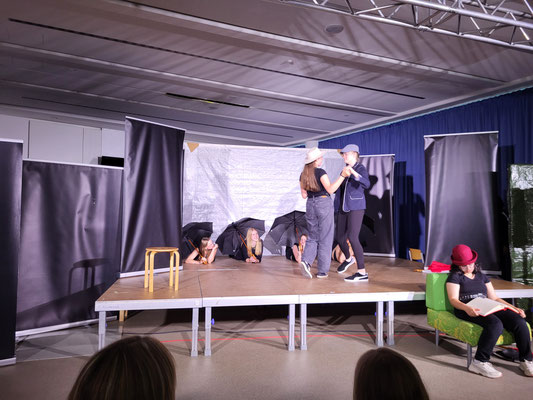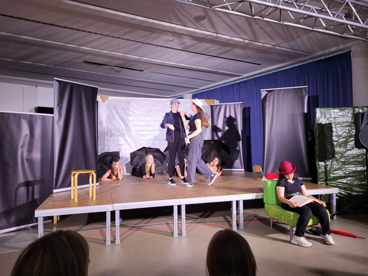 So ging es los! Rollen wurden verteilt und es wurde geprobt. Jedoch war es gar nicht so einfach, sich in eine Rolle hinein zu versetzen und eine Person zu spielen, die ein komplettes Gegenteil von einem selbst ist. Zwischendurch kamen bei uns Kursteilnehmern auch Zweifel auf, ob das Publikum der Geschichte folgen kann oder auch, ob wir selbst die Rollen gut verkörpern können. Diese Sorgen waren schlussendlich unbegründet, denn als wir unser Stück aufgeführt haben, gab es am Ende viel Applaus und zudem auch positive Rückmeldungen zur Geschichte.
