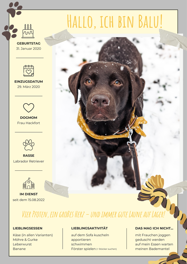 In der LehrerInnen-Konferenz am 22. Februar 2022 sowie der Schulkonferenz am 01. Juni 2022 haben wir als Schulgemeinschaft beschlossen, meinen Hund Balu an unserer Schule zuzulassen. Auf geht es also in ein neues Abenteuer mit tierischer Unterstützung auf vier Pfoten!